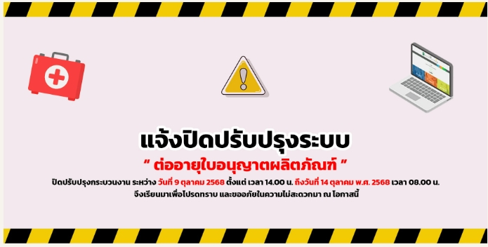 ประกาศปิดปรับปรุงระบบต่ออายุใบอนุญาตผลิตภัณ์ชั่วคราว (วันที่ 9 – 14 ต.ค. 2568)