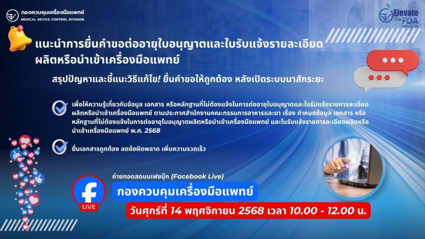 ขอเชิญชวนผู้ประกอบการรับฟังคำแนะนำการยื่นคำขอต่ออายุใบอนุญาตและใบรับแจ้งรายการละเอียดผลิตหรือนำเข้าเครื่องมือแพทย์