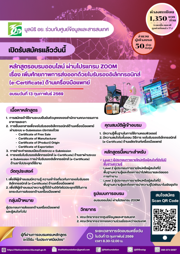 หลักสูตรอบรม “เพิ่มศักยภาพการส่งออกด้วยใบรับรองอิเล็กทรอนิกส์ (e-Certificate) ด้านเครื่องมือแพทย์”