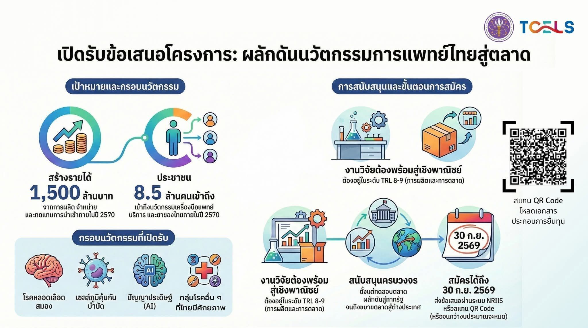 ศูนย์ความเป็นเลิศด้านชีววิทยาศาสตร์ (องค์การมหาชน) – TCELS เปิดรับข้อเสนอโครงการ ด้านการแพทย์และสุขภาพ แผนงานเป้าหมายสำคัญ “มุ่งเป้าเครื่องมือแพทย์ฯ” 9 กุมภาพันธ์ 20269 กุมภาพันธ์ 2026Khun Nongกิจกรรม, ข่าวประชาสัมพันธ์ ศูนย์ความเป็นเลิศด้านชีววิทยาศาสตร์ (องค์การมหาชน) – TCELS เปิดรับข้อเสนอโครงการ ด้านการแพทย์และสุขภาพ แผนงานเป้าหมายสำคัญ “มุ่งเป้าเครื่องมือแพทย์ฯ” 🔹 กรอบการสนับสนุน • นวัตกรรมกลุ่มโรคหลอดเลือดสมอง • นวัตกรรมด้านเซลล์ภูมิคุ้มกันบำบัด • ปัญญาประดิษฐ์ทางการแพทย์ • กลุ่มอื่นๆ ทีไทยมีศักยภาพ หรือมีมูลค่าตลาดนำเข้าสูง เช่น โรคเขตร้อน (Tropical diseses),เครื่องมือแพทย์สำหรับการวินิจฉัยภายนอกร่างการ (IVD), กลุ่มกระดูกและข้อ, ผู้สูงอายุและกลุ่มเปราะบาง, กลุ่มยาสมุนไพรไทย, อาหารทางการแพทย์, กลุ่มโรคไตวายเรื้อรัง, กลุ่ม HIV และโรคติดต่อทางเพศสัมพันธ์, อุปกรณ์ฟื้นฟู *ผลิตภัณฑ์ต้องผ่านการขึ้นทะเบียน งานวิจัยต้องอยู่ในระดับ TRL 8 – 9 (การผลิตและการตลาด / Commercialization) 🔹 กิจกรรมการสนับสนุน • Market Testing & Validation ให้พร้อมวางจำหน่ายและออกตลาดทั้งในและต่างประเทศ • สนับสนุนการทดสอบเพิ่มเติมเพื่อการขึ้นทะเบียนและขยายตลาดในต่างประเทศ • ผลักดันนวัตกรรมเทคโนโลยี โดยสนับสนุนการประเมินเทคโนโลยี (HTA) เข้าสูู่สิทธิประโยชน์ในระบบหลักประกันสุขภาพภาครัฐ 🗓️ เปิดรับข้อเสนอโครงการ ตั้งแต่วันนี้ – 30 กันยายน 2569 (หรือจนกว่างบประมาณที่ได้รับจัดสรรจะหมด) 📍 ยื่นข้อเสนอโครงการผ่านระบบ NRIIS ที่: https://nriis.go.th (แผนงานเป้าหมายสำคัญ88023 ประเทศไทยมีเครื่องมือแพทย์ บริการทางการแพทย์ ยา ที่ผลิต จำหน่าย และทดแทนการนำเข้า มูลค่า 1,500 ล้านบาท) 👇 รายละเอียดเพิ่มเติม สแกน QR Code ☎️ สอบถามเพิ่มเติมได้ที่ 02-644-5499 ต่อ 128 #TCELS #MHESI #เครื่องมือแพทย์